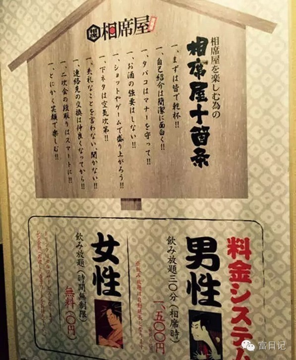 如果拼桌,男性付款,女性免费,从和女性拼桌开始,每30分钟男性需支付1500日元的酒水费用(约合人民币77元)。