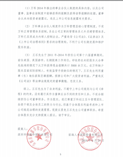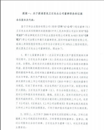 宝能方面认为,王石为了自身利益,不遵守上市公司规则与公司《章程》的约束,没有履行其作为董事应当尽到的责任和义务,不适合继续担任公司董事职务。作为股东,我们尊重万科创立至今管理团队、各级干部及全体员工的努力与付出,但基于全体股东利益考虑和上市公司规范治理的发展需要,现提议罢免王石先生公司董事职务,希望全体股东充分支持提案人提议,请予审议。