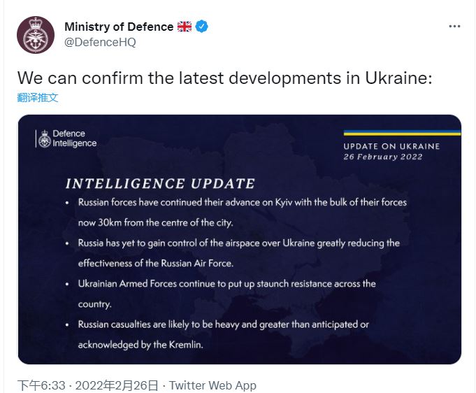 英国国防部情报还指出,俄罗斯尚未获得对乌克兰空域的完全控制,限制了俄罗斯的空中打击能力;同时,乌克兰政府军在全境进行了顽强抵抗。但美国官员估算,俄罗斯部署在乌克兰边境上军力目前只有约三分之一被派入了乌克兰。