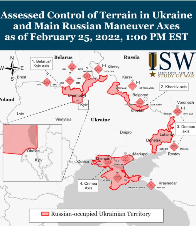 周六,俄罗斯军队进入基辅与乌克兰军队争夺电厂、主干道等关键基建控制权。双方在基辅北部、西部和东部发生交火,英国国防部情报称俄军距离基辅市中心有30公里。