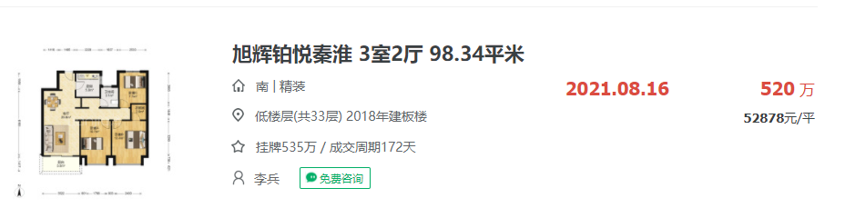 据链家网显示,目前旭辉铂悦秦淮今年1月二手房挂牌均价约50957元/㎡;最高成交价当属去年8月成交的一套建面98.34㎡的三室两厅,成交均价约52878元/㎡。