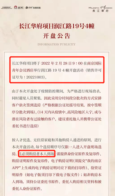 刚刚,长江华府官微发布通知称,项目将于明天上午9点,在南京国际青年会议酒店开盘,因疫情防控需要,将采用分时段分批次依次签到选房,并且每个选房顺序号仅限一人进入开盘现场,且必须购房者本人到场。