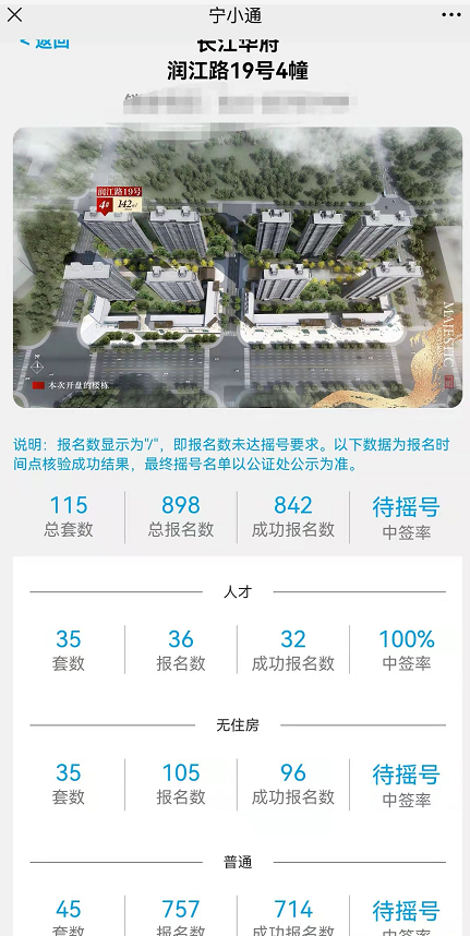 据“宁小通”显示,本次项目有效报名人数共842组,综合中签率约13.7%。其中人才有效报名人数共32组,无房有效报名人数共96组,普通有效报名人数共714组,第一轮摇号活动暂定于2022年2月27日15时开始(如有变化将及时公布)。