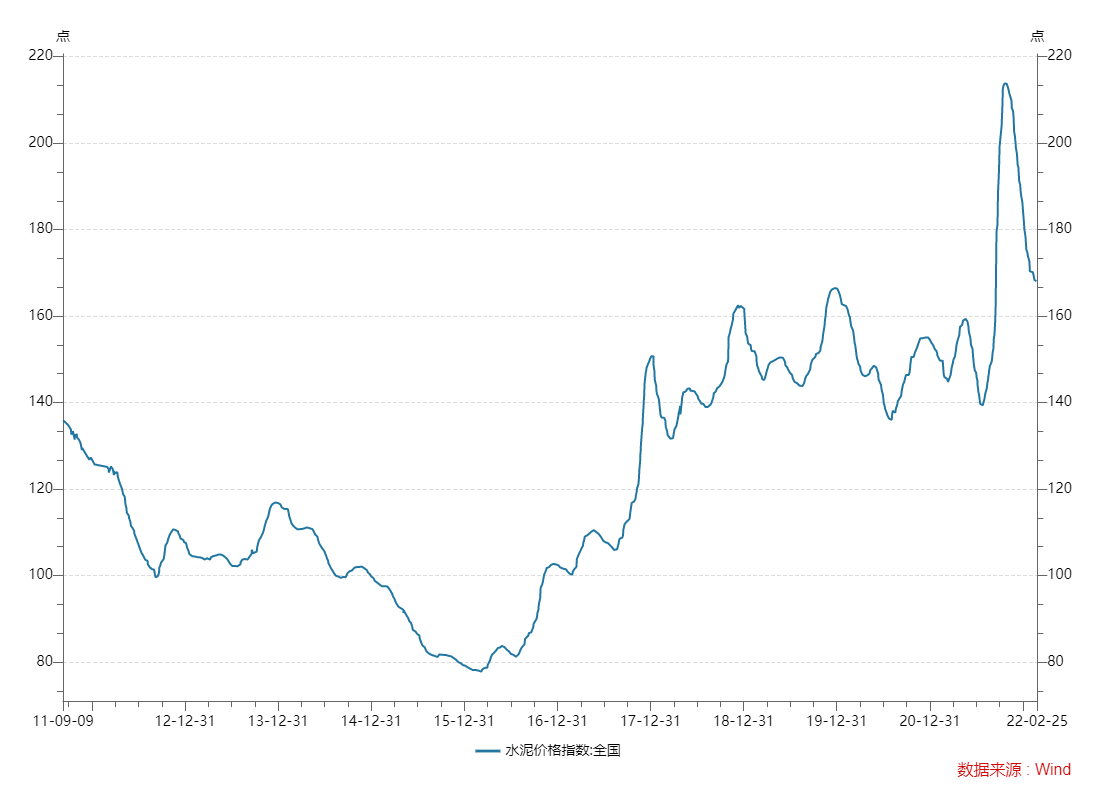 近5年来水泥价格指数一直稳定在140至165这个区间内,而政策成为突破价格平台的推手。2021年8月,随着限产限电政策落地带来的供给趋紧,水泥价格突然呈现爆发式增长,价格指数一度突破213.81。今年以来随着需求端持续疲软,水泥价格已回落至170点左右,但仍高于此前价格平台。