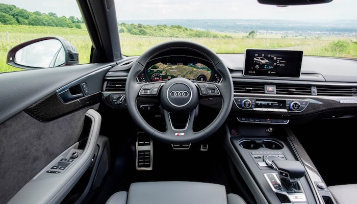 内饰方面是基于A4设计的,基本配置当然是全液晶仪表盘和MMI多媒体系统,三幅式方向盘,下方采用镂空设计,外加一个S4标志,中控台设计干净利落,层次分明。