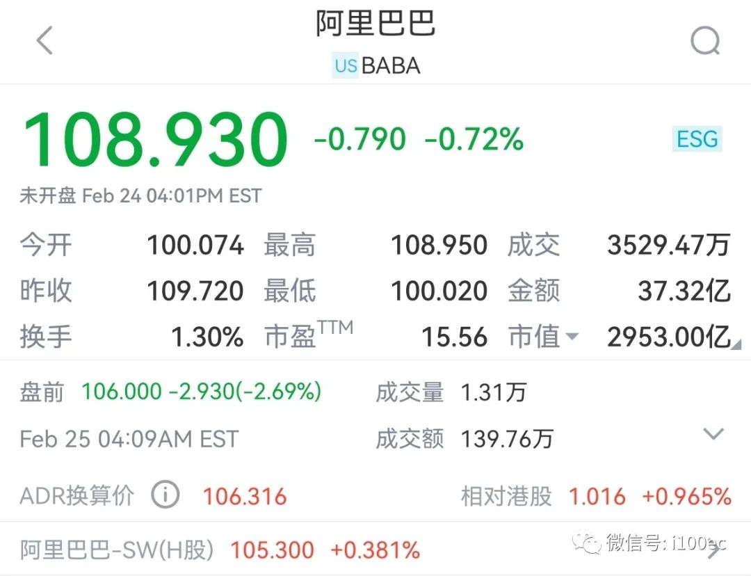 阿里于当地时间24日的美股市场上,截至收盘报108.93美元、日跌幅为0.72%,市值2953亿美元。