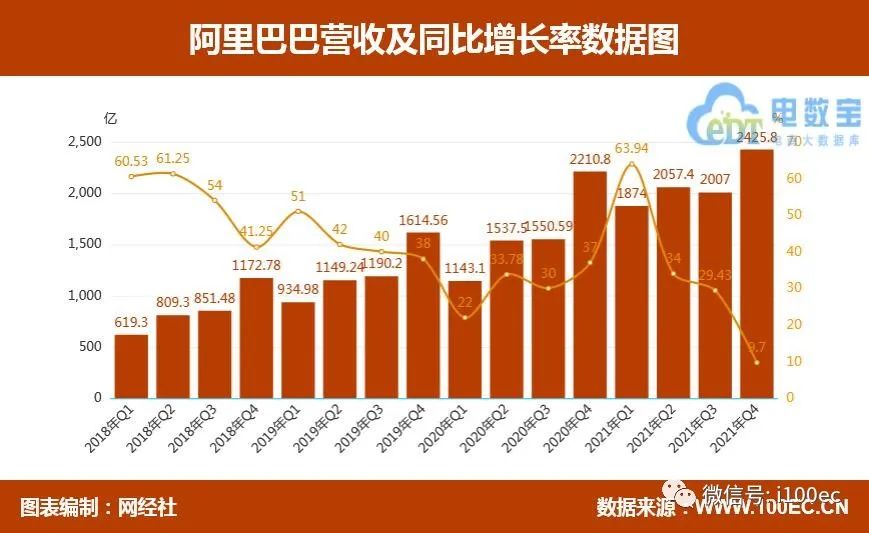 报告期内,截至2021年12月31日,阿里本季度营收2425.8亿元,同比增长9.7%,环比增长20.9%。