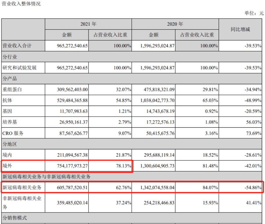 在招股书中义翘神州坦言,虽然非新冠病毒相关产品收入预计能够保持增长,但由于新冠病毒相关产品的市场需求存在较大不确定性,2021年公司总体营业收入及营业利润水平存在较上年下滑50%以上的风险。这一数据与实际情况相差无几。