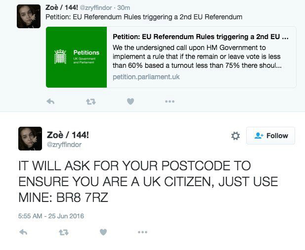 一名英国网友发推文称:“请愿网站将要求你提供邮编,请使用我的邮编:BR8 7RZ。”