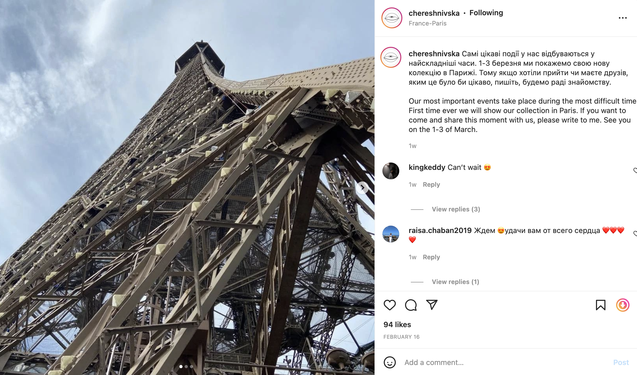 “我们现在正在组织保护所有员工的安全,更详细的信息我会在晚些时候答复。”Chereshnivska品牌发言人告诉界面时尚。这条消息回复于北京时间2月24日下午5点。在这前后Chereshnivska通过官方Instagram账号陆续发布数条消息,请求为乌克兰提供支持。