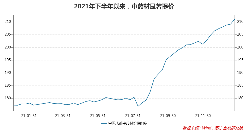 2021年下半年以来,中药材显著提价,且当前仍处于上行趋势中。中药材涨价短期内拉低了板块毛利水平,但也显著提升了市场的中药涨价预期,板块迎来短期的涨价炒作逻辑,开始受到市场关注。