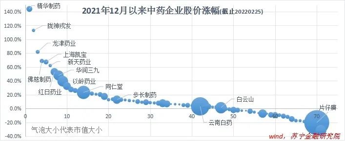 就2022年以来中药板块的这波行情来看,大市值中药企业普遍没跑赢中小市值企业。因为始于2021年12月的这轮板块行情更多地是扶持性政策催发的,自然是创新性更强的中小型中药企业涨幅更好,至于消费型中药,疫情之后的消费复苏才是更好的行情催化窗口。