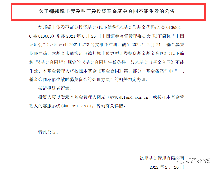 同样,德邦锐丰自去年12月2日开始发售,截至今年2月21日的发行期结束,基金亦未能满足《基金合同》生效的条件。