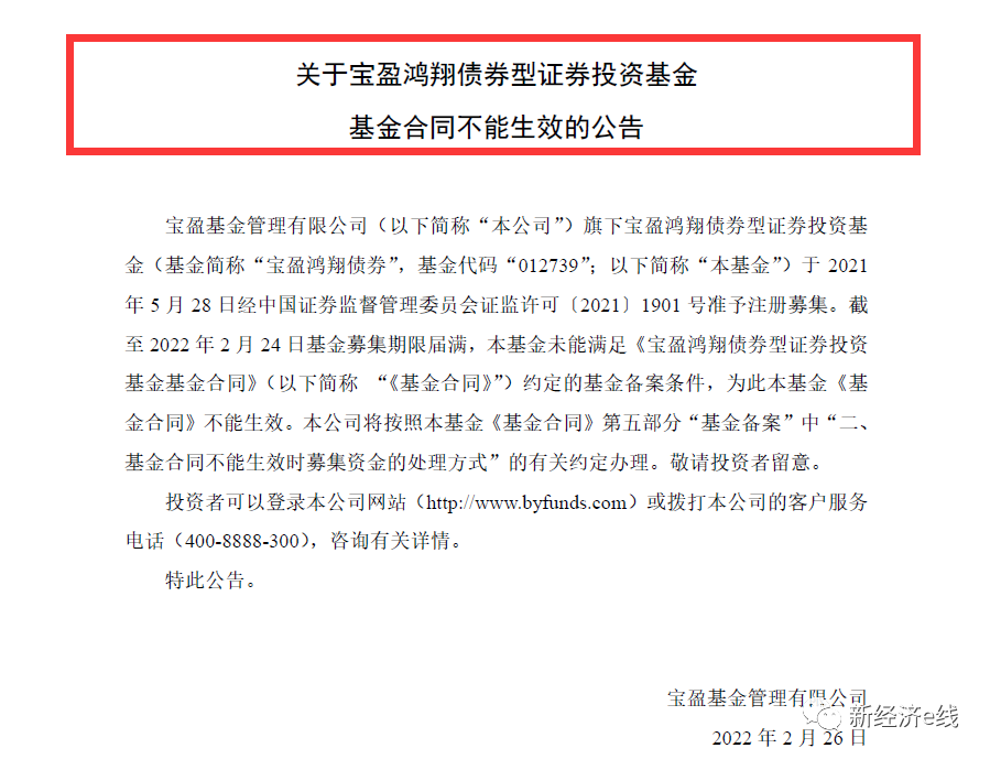 此前,宝盈鸿翔于2021年5月28日经证监会证监许可〔2021〕1901号准予注册募集。截至2022年2月24日基金募集期限届满,基金未能满足《宝盈鸿翔债券型证券投资基金基金合同》约定的基金备案条件,为此基金《基金合同》不能生效。