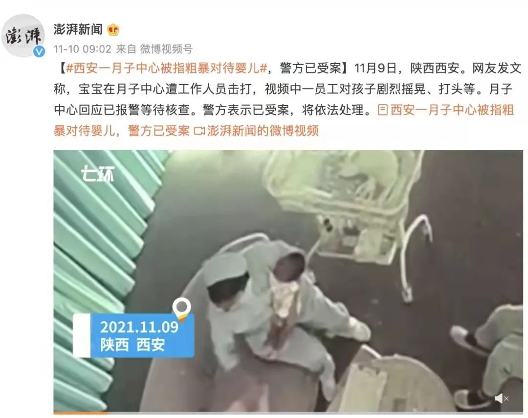 紧接着,2021年11月,一条名为《西安月子中心护理人员虐待新生儿》的视频在网络上引发巨大争议,监控画面中,月嫂多次出现对孩子进行剧烈晃动、捶胸、打嘴巴等恶劣行为。