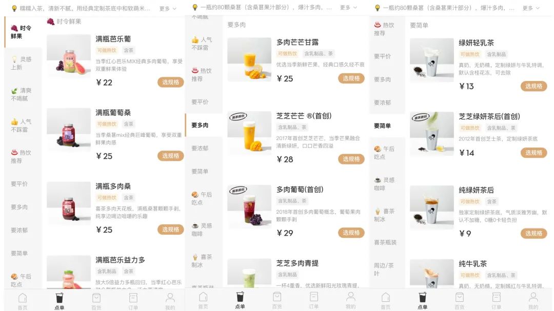 喜茶的菜单栏,已经从原本产品系列分类,变成了顾客导向:时令鲜果、清爽不喝腻、要多肉、要浓郁、要简单、要平价……