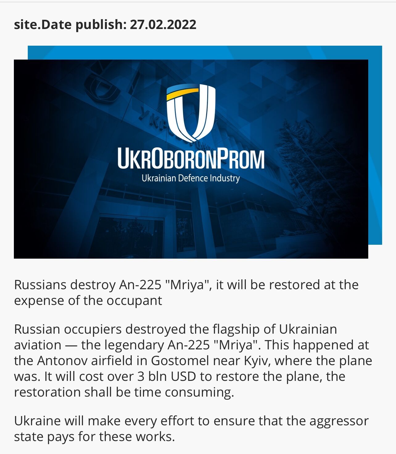 2月27日,乌克兰国防工业公司Ukroboronprom发表声明称,世界上唯一一架安-225运输机在基辅市附近的戈斯托梅尔安东诺夫机场遭俄罗斯军队摧毁,这架飞机是世界上体型最大、起飞重量最大的飞机。