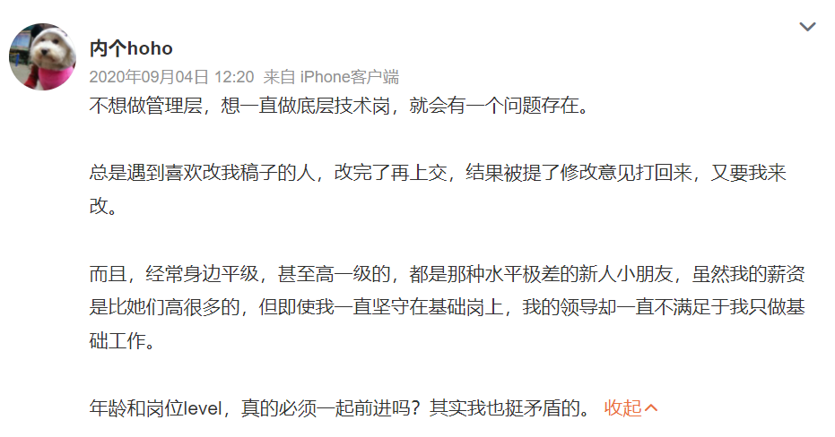 我的问题是,如果你不想管理、不带团队,一个你不认可的人带团队、一个和你水平差不多的人对你指指点点,你受得了吗?成年人的世界很复杂,不是非此即彼的。