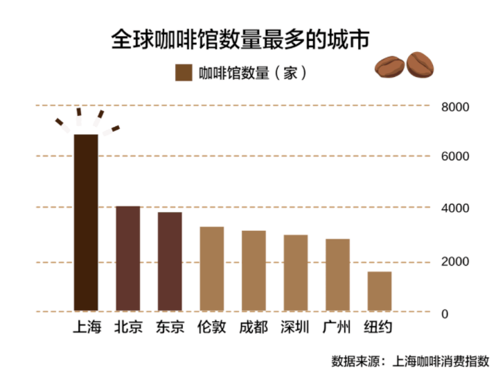 中国已经是货真价实的咖啡消费大国。根据《2021年上海咖啡消费指数》显示,上海共有近7000家咖啡店,超越东京、伦敦、纽约,以压倒性态势占据世界第一位。另据不完全统计,有超过六成的咖啡爱好者每周饮用三杯及以上的咖啡数量,而有超过三成的消费者钟情于咖啡探店。