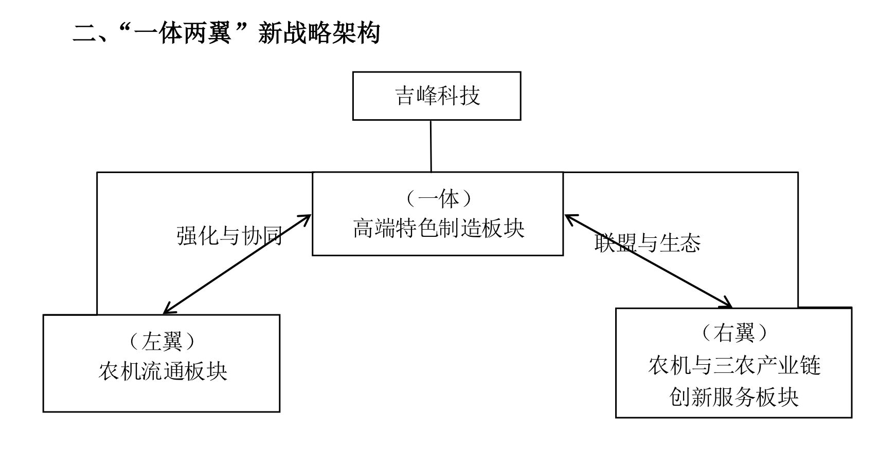 2022年2月18日,吉峰科技提出“一体两翼”,这“一体”定位高端特色制造板块,吉峰科技要将自己打造成“专精特新”农机与核心零部件企业加速资本化、国际化的赋能平台;“左翼”是传统的农机流通板块,“右翼”指农机与三农产业链创新服务板块。