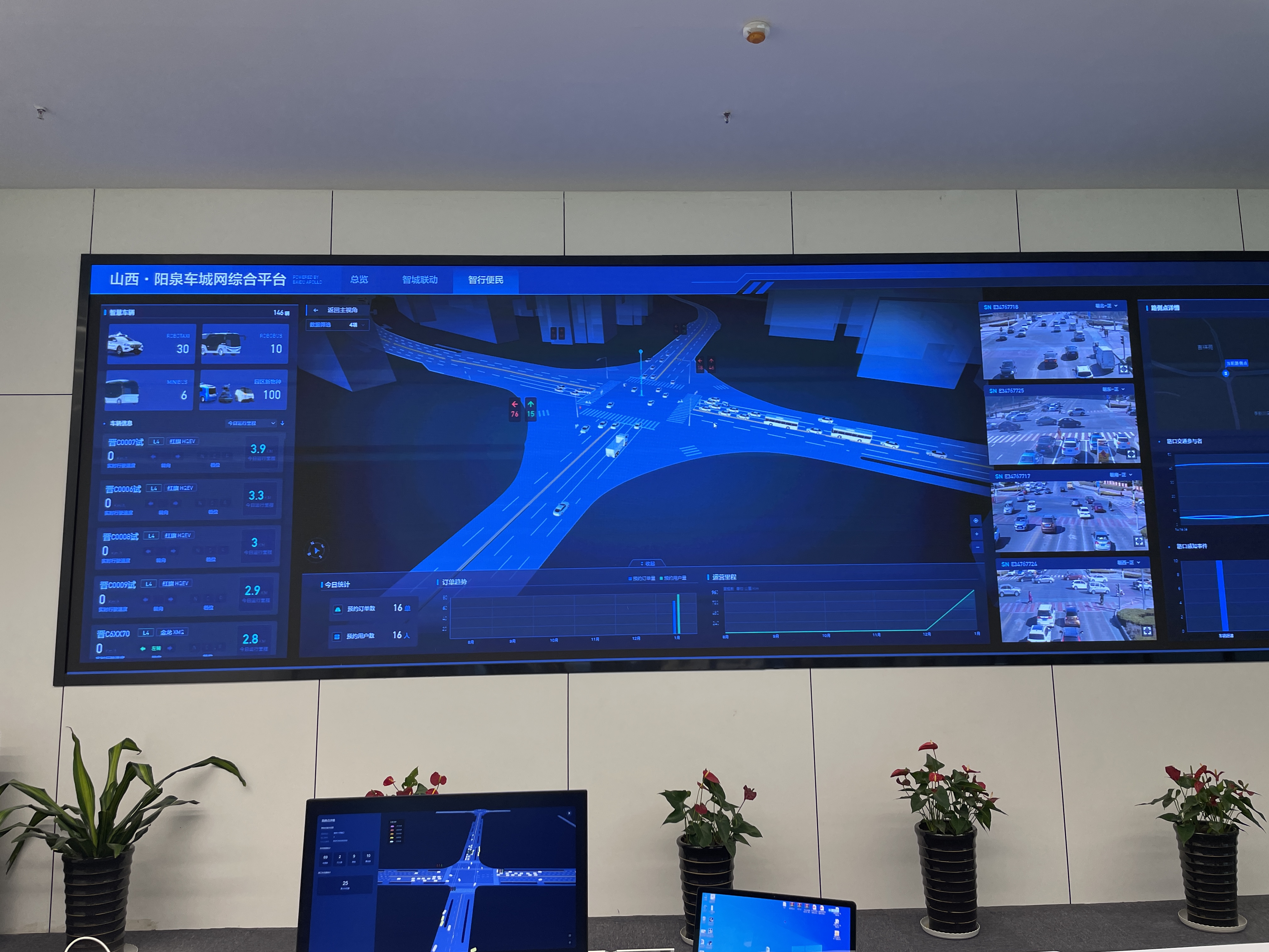 通过已经改造的路网和阳泉车城网综合平台,在Apollo Park的监控大屏上可实时观测各路口的交通状况,以及“萝卜快跑”Robotaxi车队的派单及运行情况,对道路上的违章车辆也能进行实时捕捉。