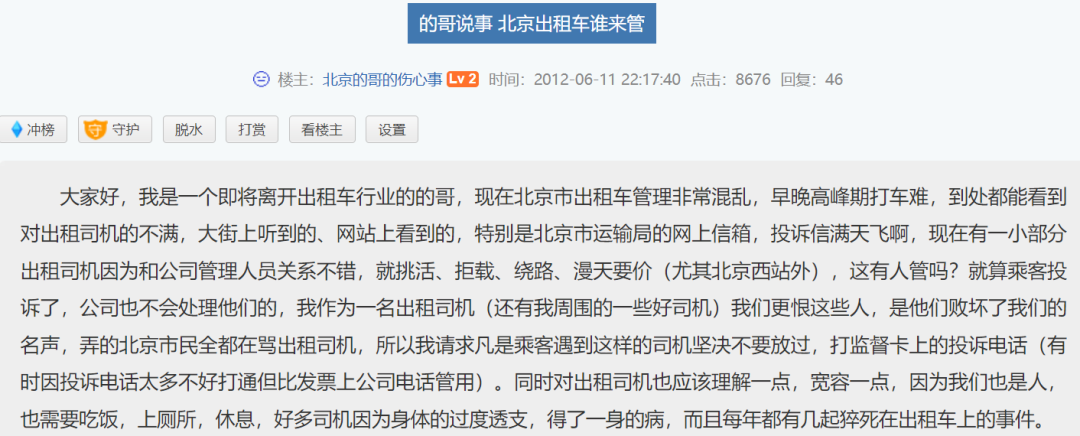 在北京生活时间较长的人,大多有被出租车拒载过、涨价(不走表)或者被司机怼过的经历。2012年一位即将离职的北京出租车司机,曾在天涯发帖怒斥部分出租车司机给行业抹黑,并鼓励乘客一旦遇到这样的司机,一定要打监督卡上的投诉电话。