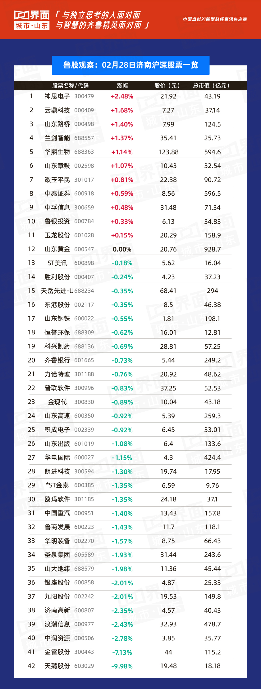 济南市涨幅榜首:神思电子(300479),涨幅2.48%,股价21.92元,总市值43.19亿元;