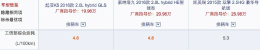 按照起亚K5混动车型百公里综合油耗4.8L来计算,也就每百公里比传统动力车型油耗低了2.6L,但是却多支付了至少6万元(含终端优惠后的卖价)购车费用支出。