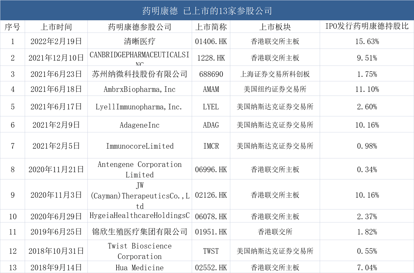 这是药明康德在13家参股IPO公司中持股最多的一家。2018年9月至今,上图所列公司陆续完成IPO,药明康德持股比例从0.34%到15.63%不等。