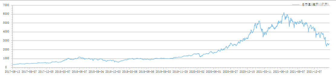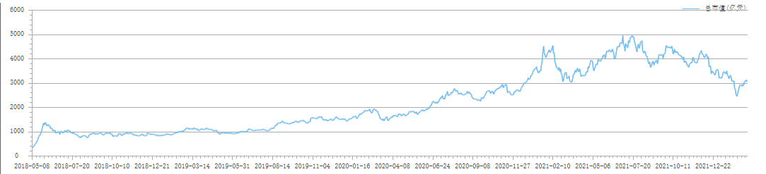 药明生物在2021年6月28日市值最高冲至6170亿港元(折合人民币4984亿元)。自此开始震荡下跌,截至2022年3月1日市值约为2839亿港元(折合人民币 2292亿元),总市值跌去54%。