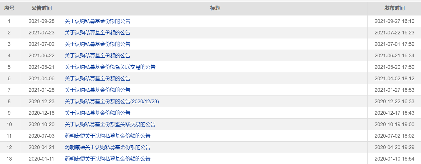 自上市以来药明康德发布认购私募基金的公告就达16则。2019年、2020年和2021年出资认购的私募基金分别为2只、7只和7只。