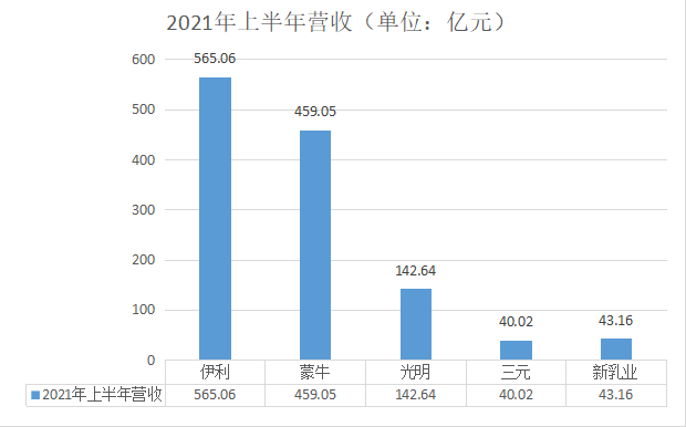 根据2021Q2财报显示,2021年上半年伊利营收为565.06亿元,蒙牛为459.05亿元。而排名第三的光明仅为142.64亿元,与蒙牛的差距达到了三百亿之多。而像三元、新乳业等规模更小的地方性乳企营收都在50亿元以下。