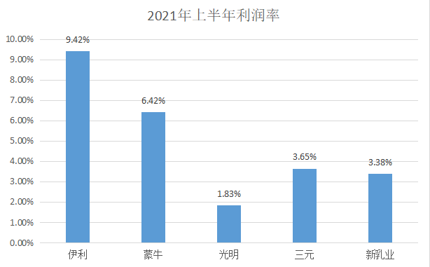 2021年上半年数据显示,新乳业的利润率为3.38%,远低于同期伊利和蒙牛的9.42%和6.42%,同时也不及三元股份的3.65%。值得一提的是,在广告费用支出上,新乳业比主打北京地区的三元股份还要高出1.6亿元。