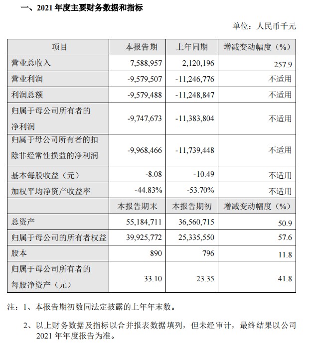 近日,回A股不足百天的百济神州(688235.SH)披露了2021年度业绩快报。经初步核算之后的主要财务数据为,全年营业总收入75.89亿元,同比增长257.9%,但是归属于母公司所有者的净利润为-97.48亿元,扣非归母净利润则达到-99.68亿元。一年亏掉近百亿。