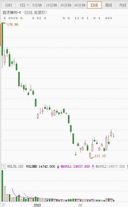 2021年12月15日百济神州上市交易首日,开盘价为176.96元/股,开盘即“破发”,最后收于160.98元/股,全天跌16.42%(和发行价相比)。随后,百济神州股价持续下跌,2022年2月14日触及最低点111.12元/股。截至2月28日收盘,百济神州股价为121.55元/股,和发行价相比,已经跌去了36.89%。