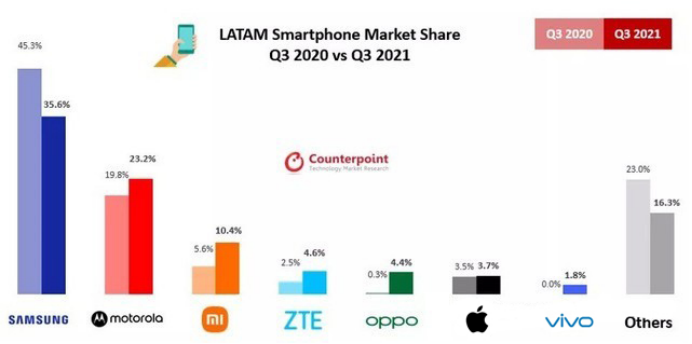 据Counterpoint Research的报告显示:南美洲智能手机市场逐步升温,2021年至少有五个新品牌进场;其中市场占有率第一的是三星,第二至七名分别是:摩托罗拉、小米、中兴、oppo、苹果、VIVO。