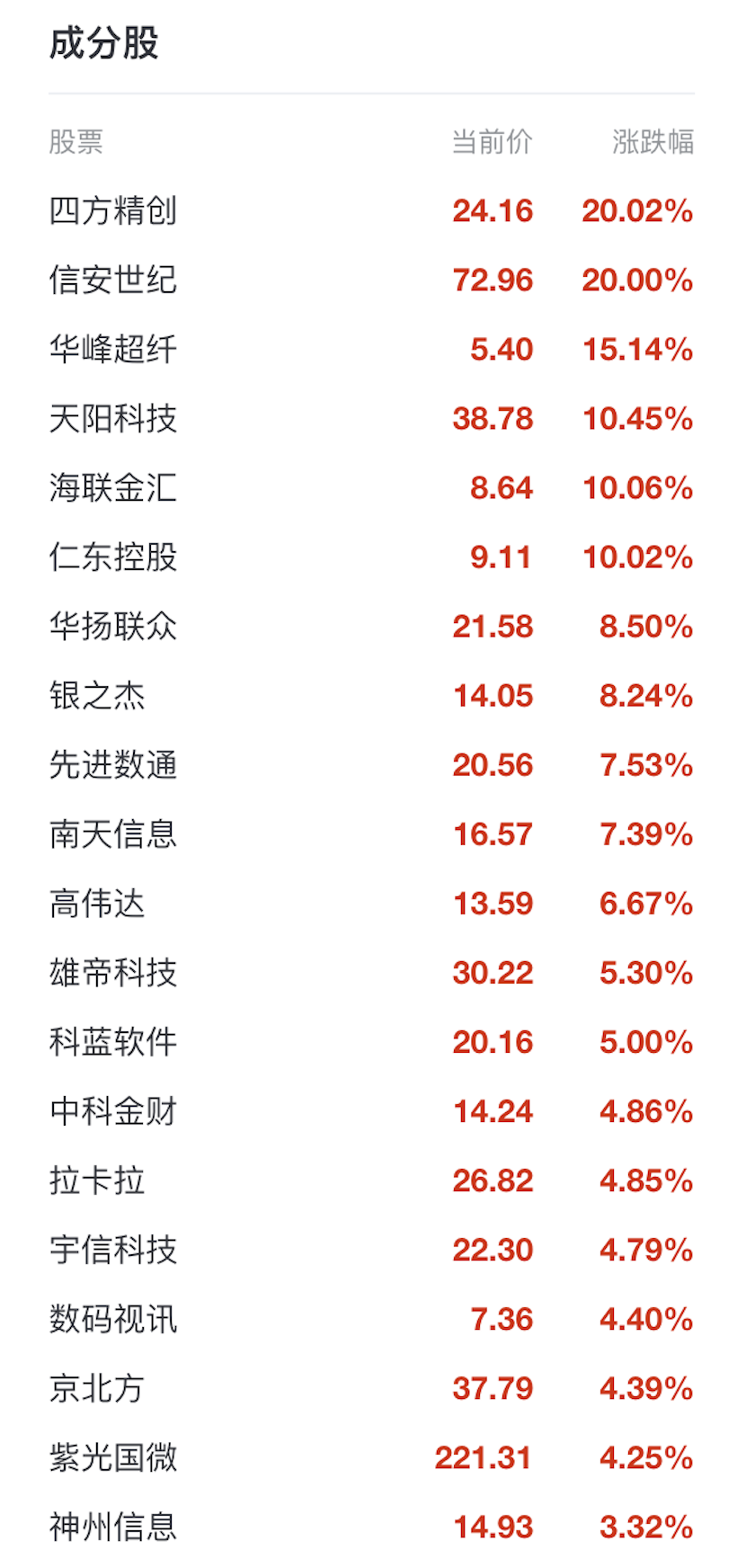 四方精创(300468.SZ)、信安世纪(688201.SH)、海联金汇(002537.SZ)涨停,华峰超纤(300180.SZ)、天阳科技(300872.SZ)暴涨10%以上,科蓝软件(300663.SZ)、宇信科技(300674.SZ)上涨5%左右。