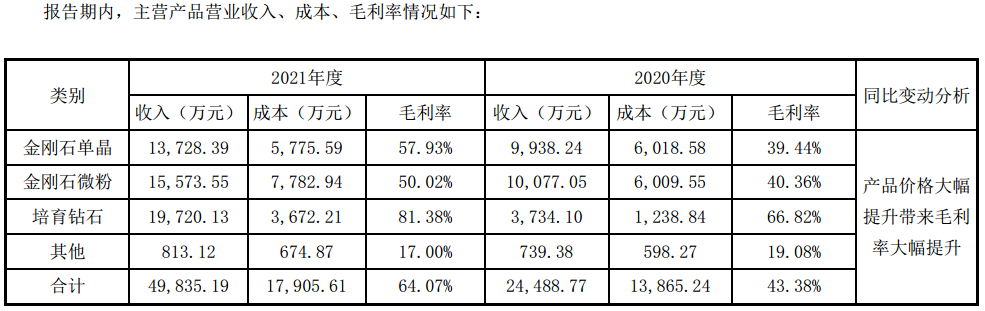 力量钻石表示,产品价格大幅提升带来毛利率大幅提升。从市场来看,工业金刚石单晶市场供应紧张,销售价格上涨明显;同时,培育钻获得市场认可,市场缺口增加。