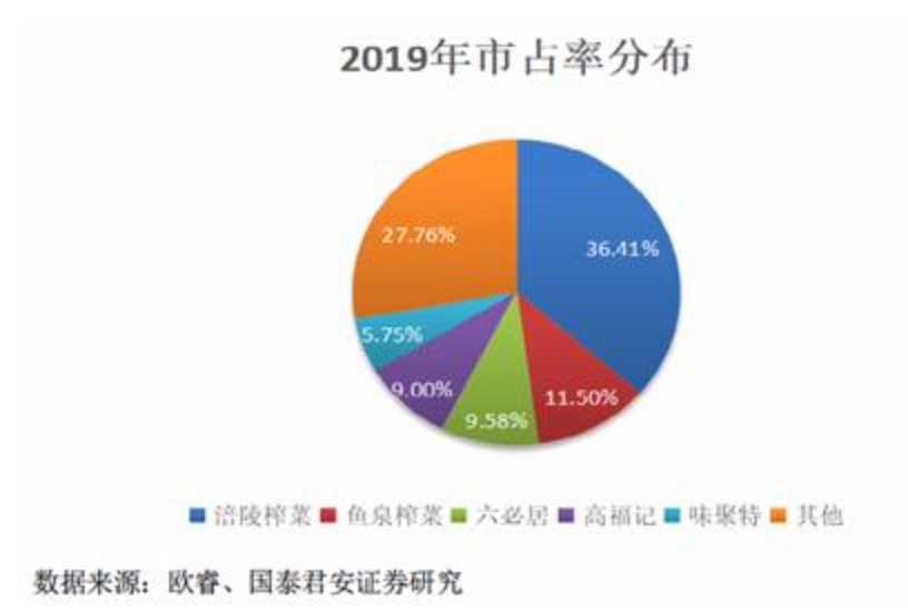 公开信息显示,2019年末,涪陵榨菜的市占率已经达到36.41%,较第二名的11.5%高出两倍以上。在这样一种近乎垄断的地位下,要继续提升市占率,难度可想而知。