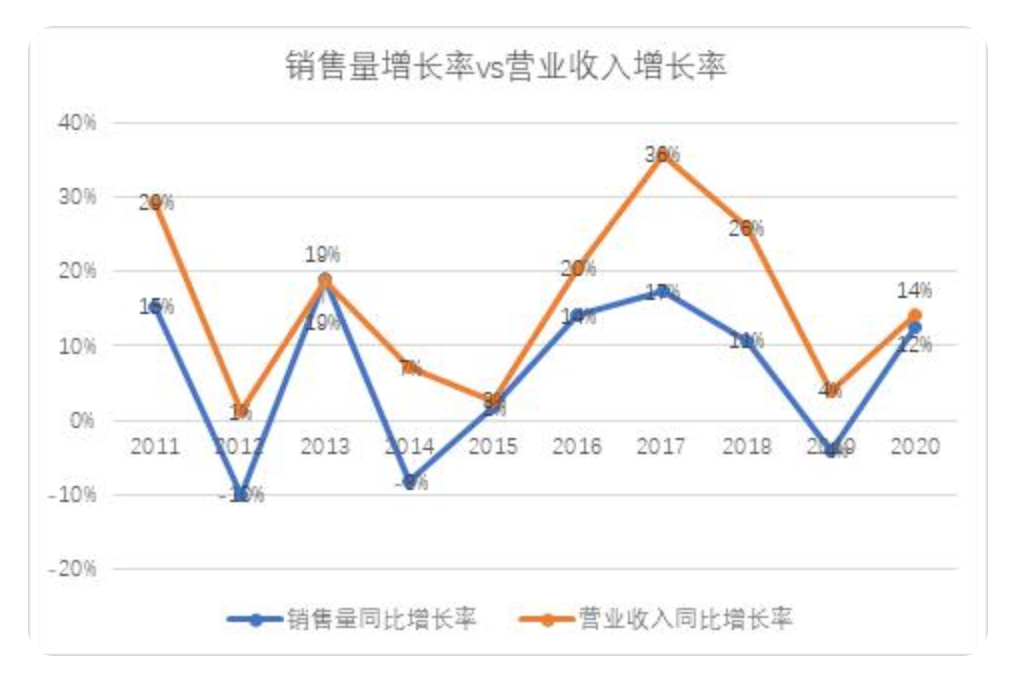 2011-2020年间,涪陵榨菜产品销售量的增长率一直低于营业收入的增长率。也就是说,业绩增长有很大部分是依靠产品价格提升。由此可见,去年底的突击涨价,可谓用心良苦。