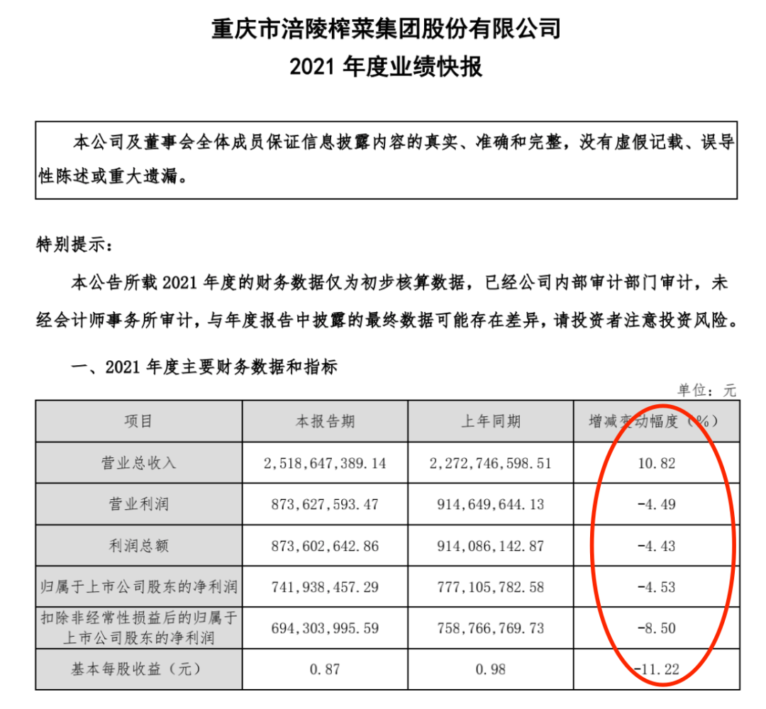 2月24日晚间,涪陵榨菜发布业绩快报显示,2021年公司实现营业总收入25.19亿元,同比增长10.82%;归属于上市公司股东的净利润为7.42亿元,较去年同期减少了4.53%。