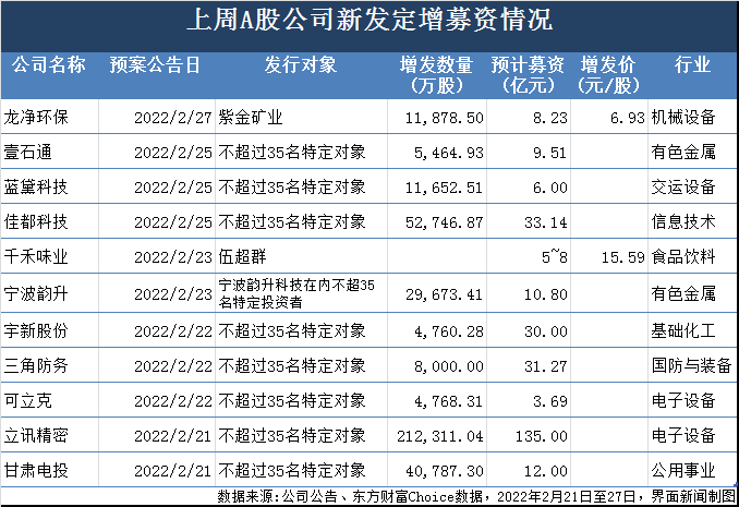 2022年2月21日至2月27日,立讯精密(002475.SZ)、佳都科技(600728.SH)、三角防务(300775.SZ)、宇新股份(002986.SZ)、甘肃电投(000791.SZ)、宁波韵升(600366.SH)、壹石通(688733.SH)、龙净环保(600388.SH)、千禾味业(603027.SH)、蓝黛科技(002765.SZ)、可立克(002782.SZ)等11家A股上市公司发布新的定增计划,预计募资额合计279.65亿元。