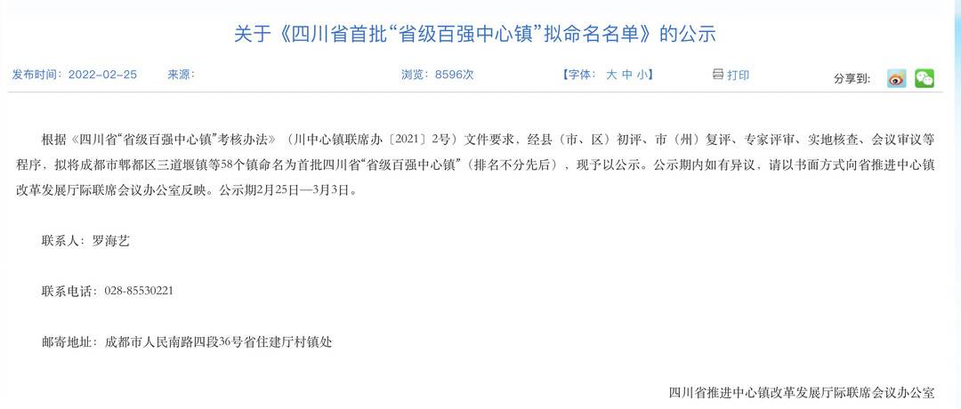 根据《四川省“省级百强中心镇”考核办法》(川中心镇联席办〔2021〕2号)文件要求,经县(市、区)初评、市(州)复评、专家评审、实地核查、会议审议等程序,拟将成都市郫都区三道堰镇等58个镇命名为首批四川省“省级百强中心镇”(排名不分先后),现予以公示。公示期内如有异议,请以书面方式向省推进中心镇改革发展厅际联席会议办公室反映。公示期2月25日—3月3日。