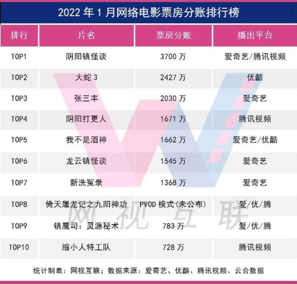 网视互联根据爱奇艺、优酷、腾讯视频、云合数据等公布的相关票房,整理出了全网网络电影票房分账榜TOP10。