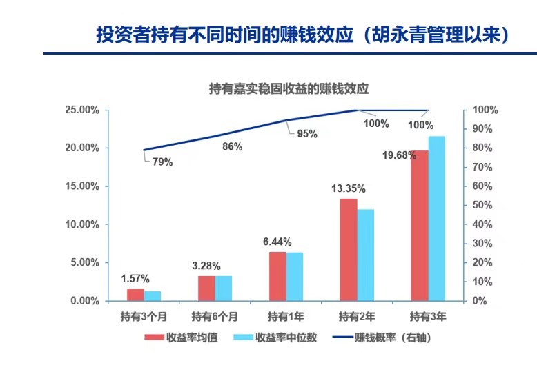 总结下来,随着持有时间的拉长,嘉实稳固收益持有人赚钱的概率、赚钱的多少都在增加,嘉实稳固的产品持有时间对赚钱效应的边际贡献明显。数据统计还发现,嘉实稳固的持有人赚钱效应是随时间拉长而逐步提升。