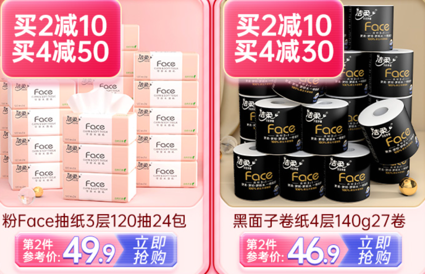 尽管如此,但在终端零售市场上,纸企们仍然难逃价格战。界面新闻在广州华润万家、家乐福等超市走访时留意到,包括维达国际、中顺洁柔和恒安国际旗下的卷纸、抽纸和女性卫生用品都在进行不同程度的促销。以华润万家为例,目前正打出“相同两件享受5-6折”的优惠。