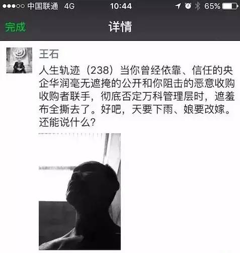 24小时内,王石收到了两份“独立宣言”。一份来自他爱的女人——田小姐,一份来自他信任过的伙伴——华润。