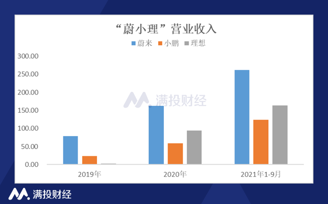 从收入来看,2021年前三季度,蔚来的营业总收入为262.36亿元,同比增长173%,蔚来的收入规模呈快速增长的趋势,仍居“蔚小理”之首。但小鹏和理想近几年来的成长非常快速,构成蔚来最大的竞争压力。2019年,蔚来的收入规模是小鹏的三倍,如今这个差距在迅速缩小,理想2019年的全年收入仅2.84亿元,而2021年前三季度收入已经超越了小鹏。