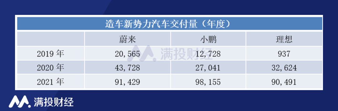 2021年,小鹏汽车和理想汽车的交付量分别为98,155辆和90,491辆,同比增长263%和177%。从交付量来看,小鹏汽车2021年的全年交付量首次超越蔚来,成为三者之首。从增速来看,理想汽车的增速惊人,自2019年12月4日理想ONE正式开启交付以来,理想汽车仅用12个月零14天就完成了第一个30000辆的交付,创下新造车势力首款车型最快交付纪录。