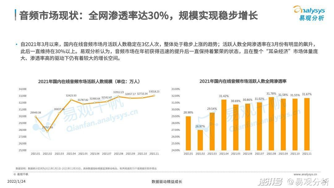 随着音质传输的升级、智能交互的深化、终端场景的拓宽,在线音频内容消费时长伴随着技术升级正在加速驶入发展快车道。根据易观分析数据显示,2021年中国“耳朵经济”市场的活跃用户规模已达到8亿人次,其中在线音频细分市场的月活跃人数稳定在3亿人次,且呈现出稳步上涨的态势。